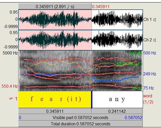 - メニューの「Formant」>「Show formant」で「フォルマント」を表示(赤い点線)