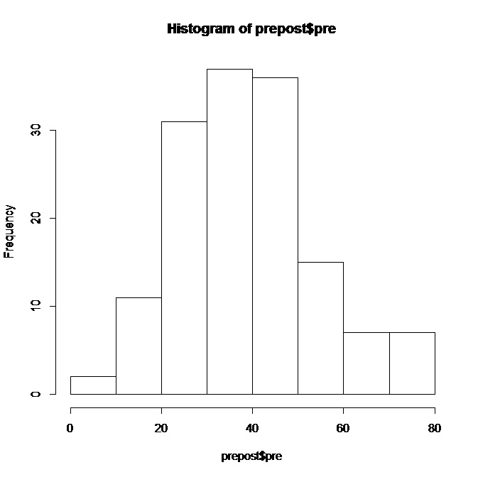 - ヒストグラムを見てみる。 hist(prepost$pre)